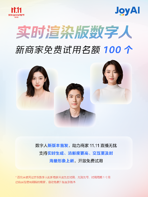 京东此次正在11.11推出免费AI增加东西包,基于JoyAI大模子,保守内容制做模式周期长、及时衬着数字人面向新商家供给100个免费试用名额,支撑AI商品图生成、数字人视频制做等功能。